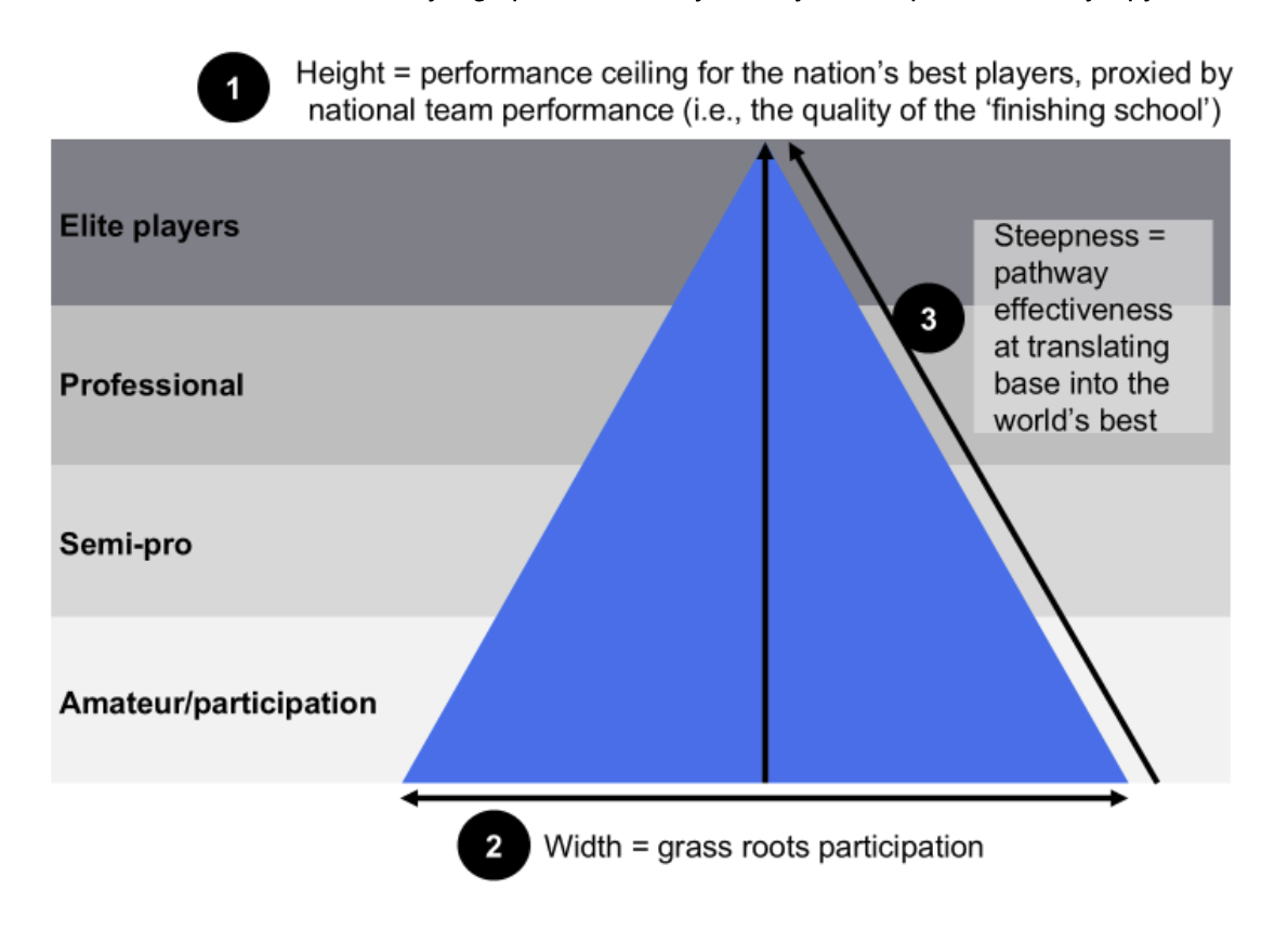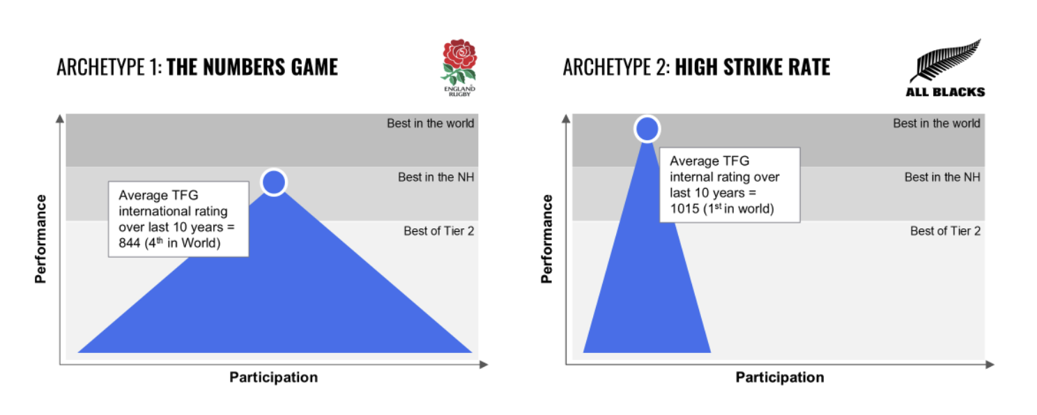 New Zealand’s All Blacks are perhaps the archetypal example of a “stretched pyramid”, dominating international rugby for decades despite having a participation base that is 10-15% of England. The core difference is not the conversion of participation into professionals, but the system’s ‘strike rate’ in transitioning its professional players into the world’s best.