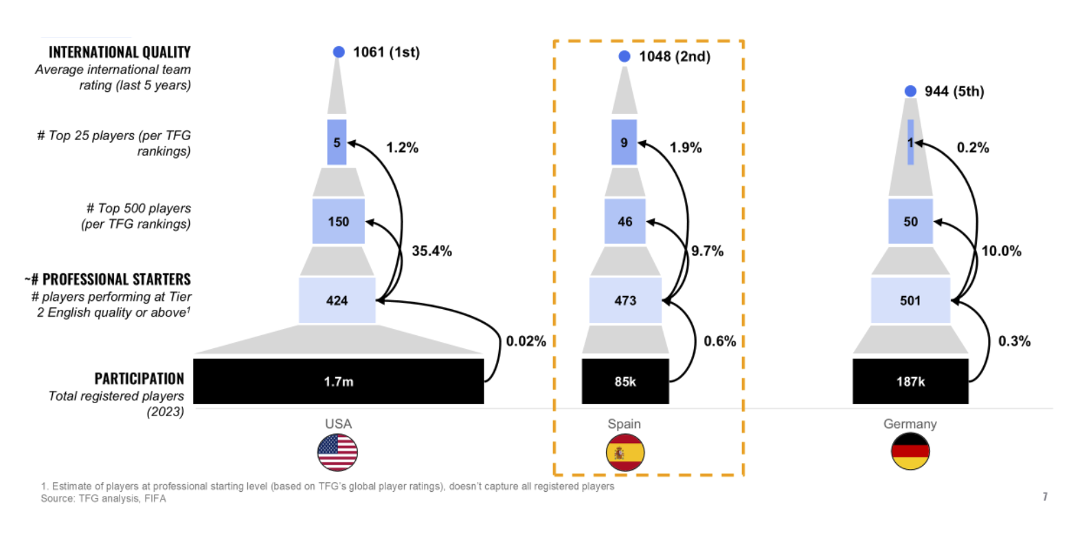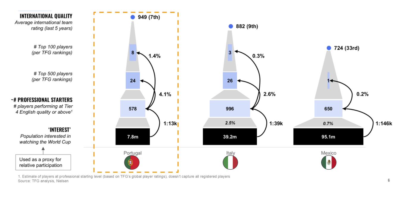 Portugal’s core advantage lies in its elite talent strike rate, with the system ranking 1st in the world for its conversion of professionals into top 500 and top 100 players per TFG ratings (4.1% and 1.4% respectively).