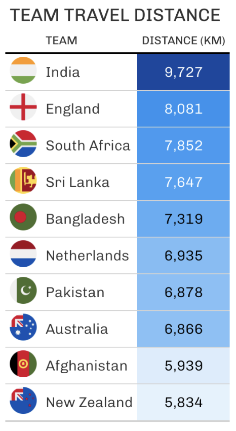 The geographical size of the host nation India provides a challenge to the schedule, particularly as the 10 venues chosen to hold group-stage games are spread widely across the country. Teams are having to undertake significant travel – both in terms of the frequency and length of journeys.
