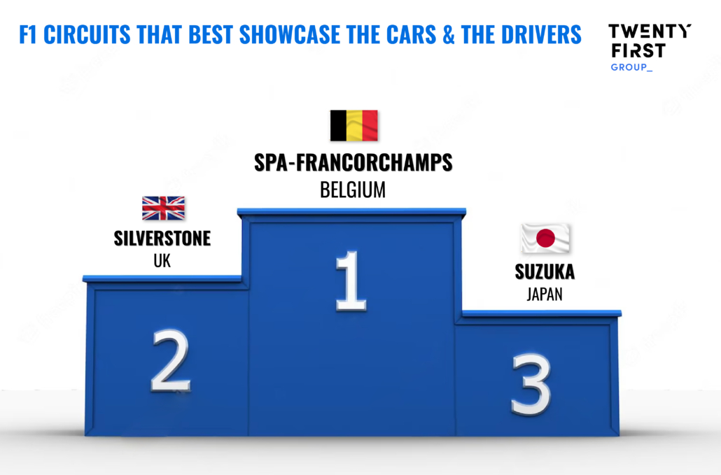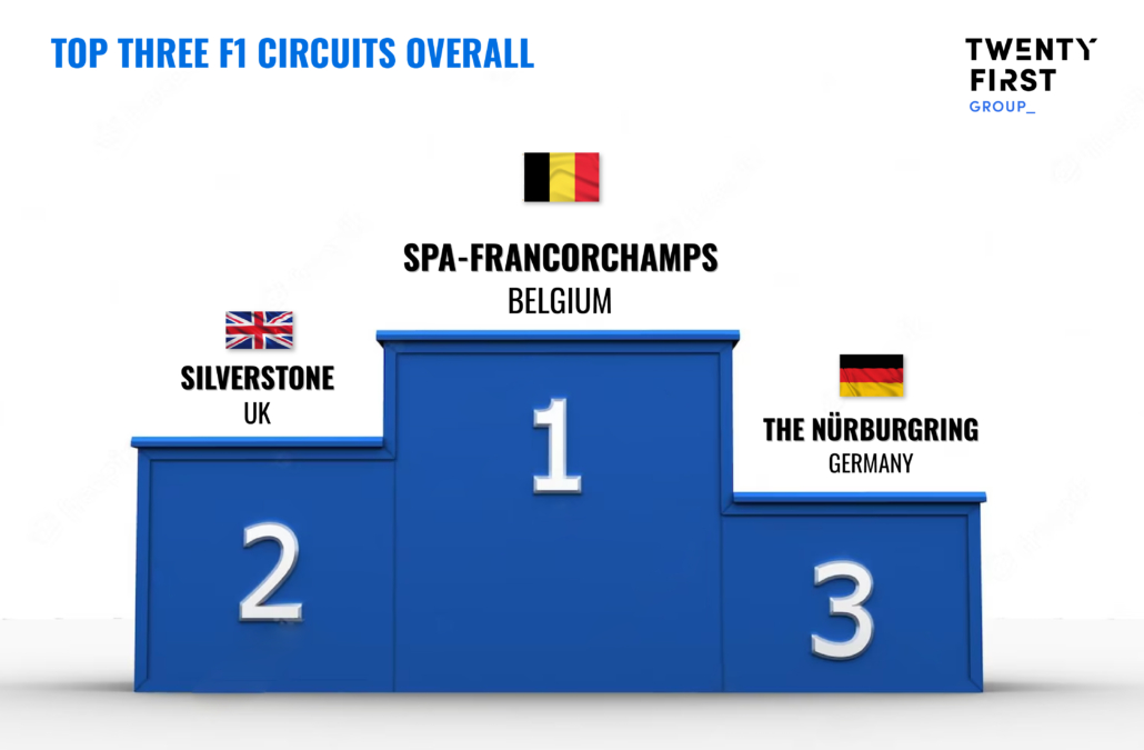 According to our Intelligence Engine the top three circuits overall are Spa-Francorchamps (Belgium), Silverstone (UK) and the Nürburgring (Germany).