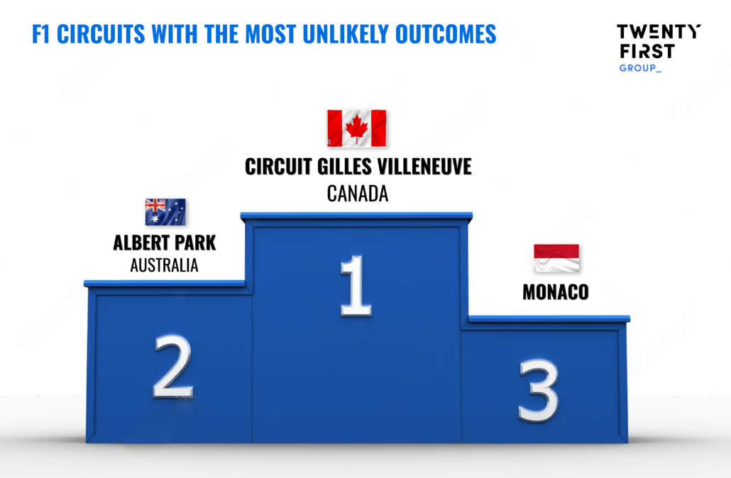 - Unlikely outcomes: which tracks are most likely to lead to unexpected outcomes, with drivers lower down the season standings pulling off shock results.
