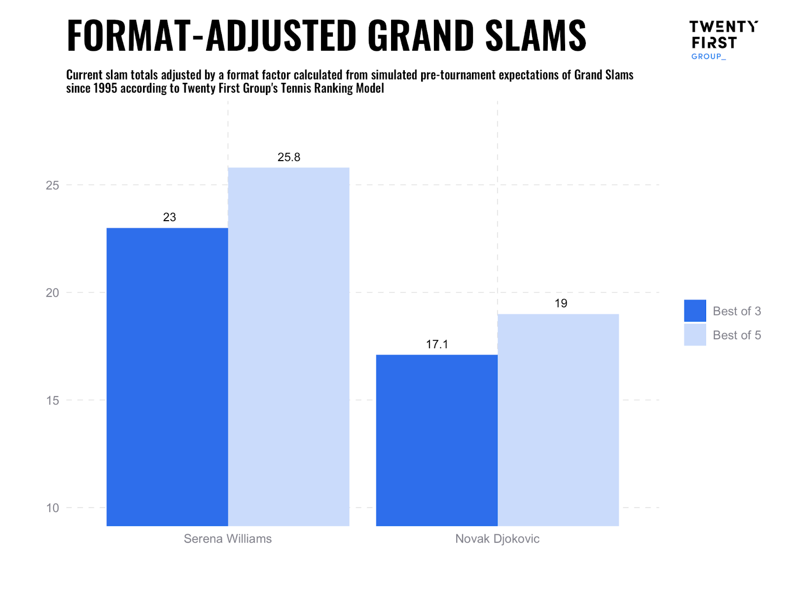 Given that Williams has been the strongest player at the vast majority of tournaments that she has entered, playing over five sets would have suited her. To prove this, we used our Intelligence Engine to simulate the performance of both Williams and Djokovic at every grand slam they played, but with the formats swapped (i.e. with women playing over five sets and men three). In this alternative reality, we estimate that Williams would have a total of 25.8 slams on average, while Djokovic would have only 17.1. The misconception that winning over three sets is easier acts as an inappropriate anchor on any appraisal of Williams’ and her peers’ claim to greatness.