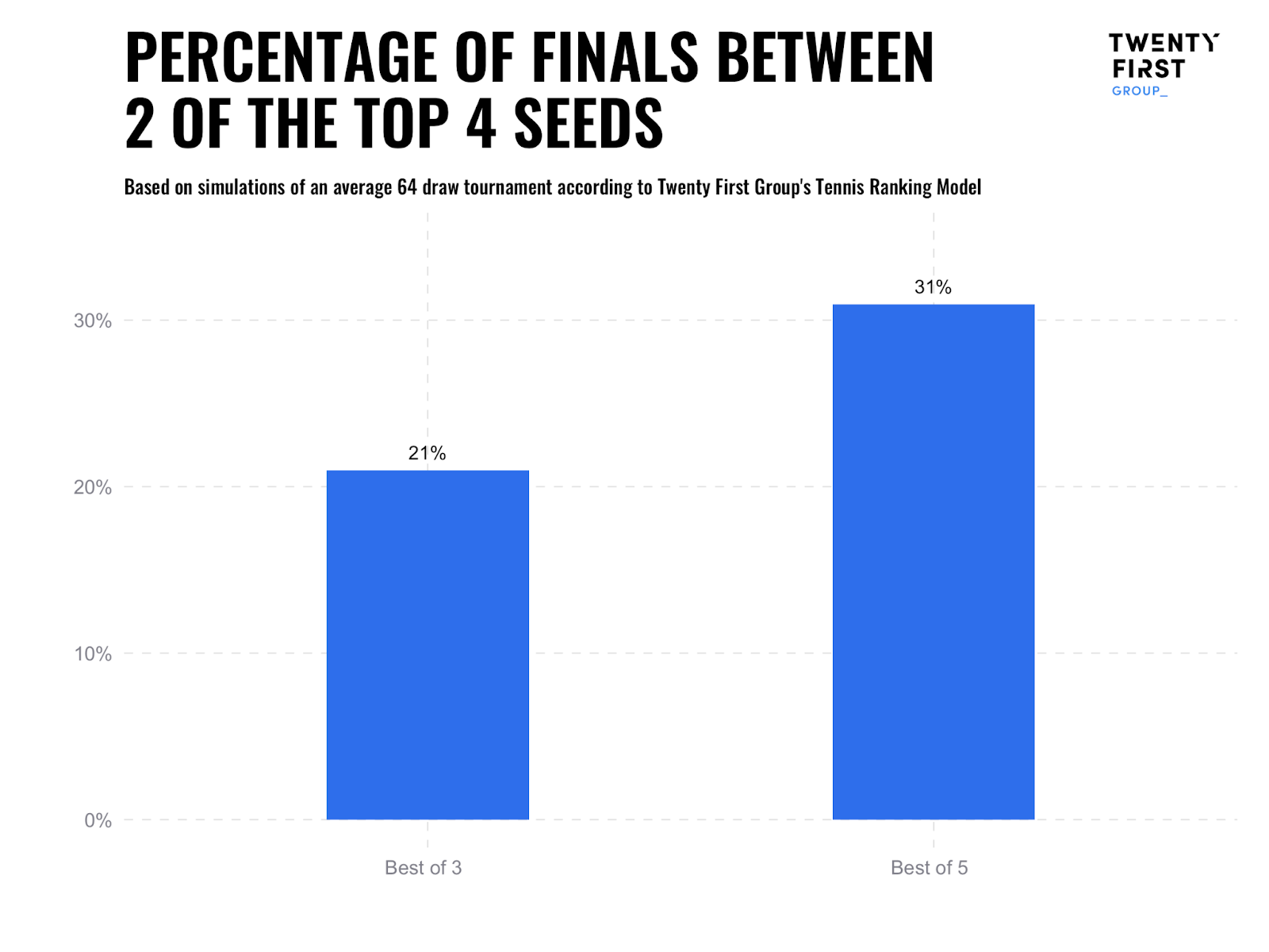 The logic behind this is simple – the longer the match the more likely it is that the best player will triumph. This is true of any sport. Manchester City are more likely to finish above Crystal Palace in a league football season than they are to win a one-off match. More time means more opportunity for quality to prevail, limiting randomness. This means that the five set format is more predictable, with the best players more likely to win. Based on our simulations, the best player is likely to win a five set tournament around 31% of the time, relative to 23% for the best player in a three set tournament.