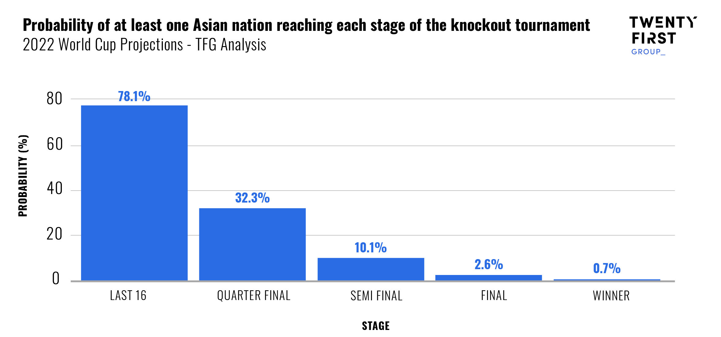 There is cause for optimism, with nearly a four in five chance (78%) of an Asian team reaching the last 16 – a feat achieved only by Australia (2006), Japan (2002, 2010, 2018) and South Korea (2002, 2010) since 2000. There is a one-in-three chance of a quarter final, and a one-in-10 chance of reaching a semi-final, which has only ever been achieved by South Korea in 2002.