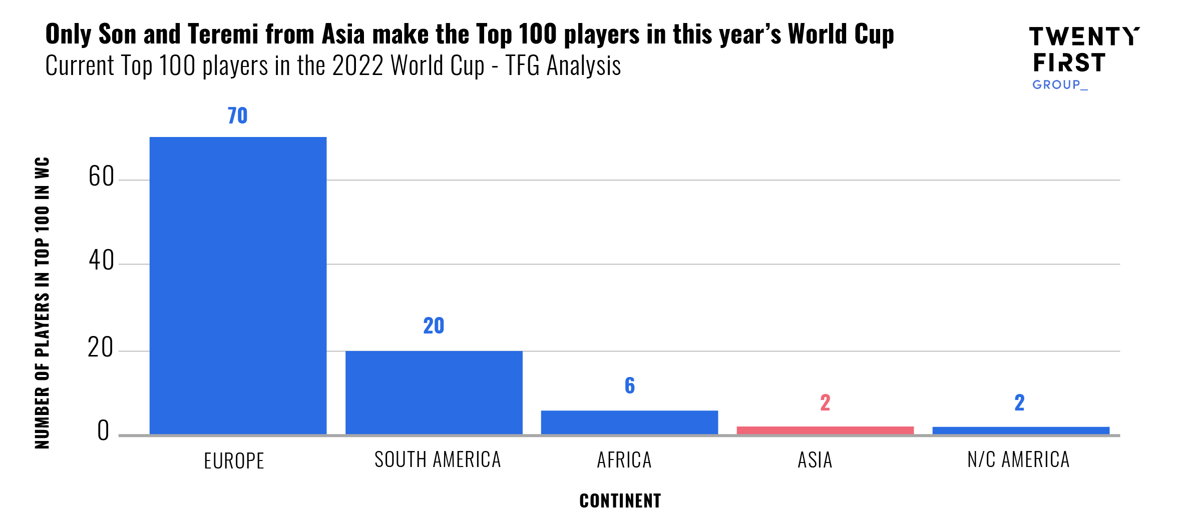 Only two of the top 100 players at the tournament are Asian (Son & Teremi) – equal to North & Central America. Unsurprisingly, Europe dominates with 70% of the top 100 players, while South America are second with 20%. If Asian teams are to enjoy more success at future World Cup’s, this is a stat that will need to improve significantly over future years. Investing in talent pathways through enhanced coaching, encouraging opportunities for young players in domestic football, and creating opportunities for promising young players to get meaningful playing time overseas would all help accelerate the development of Asian talent.