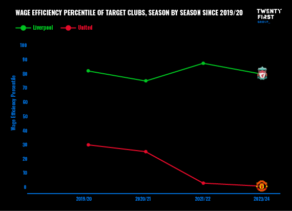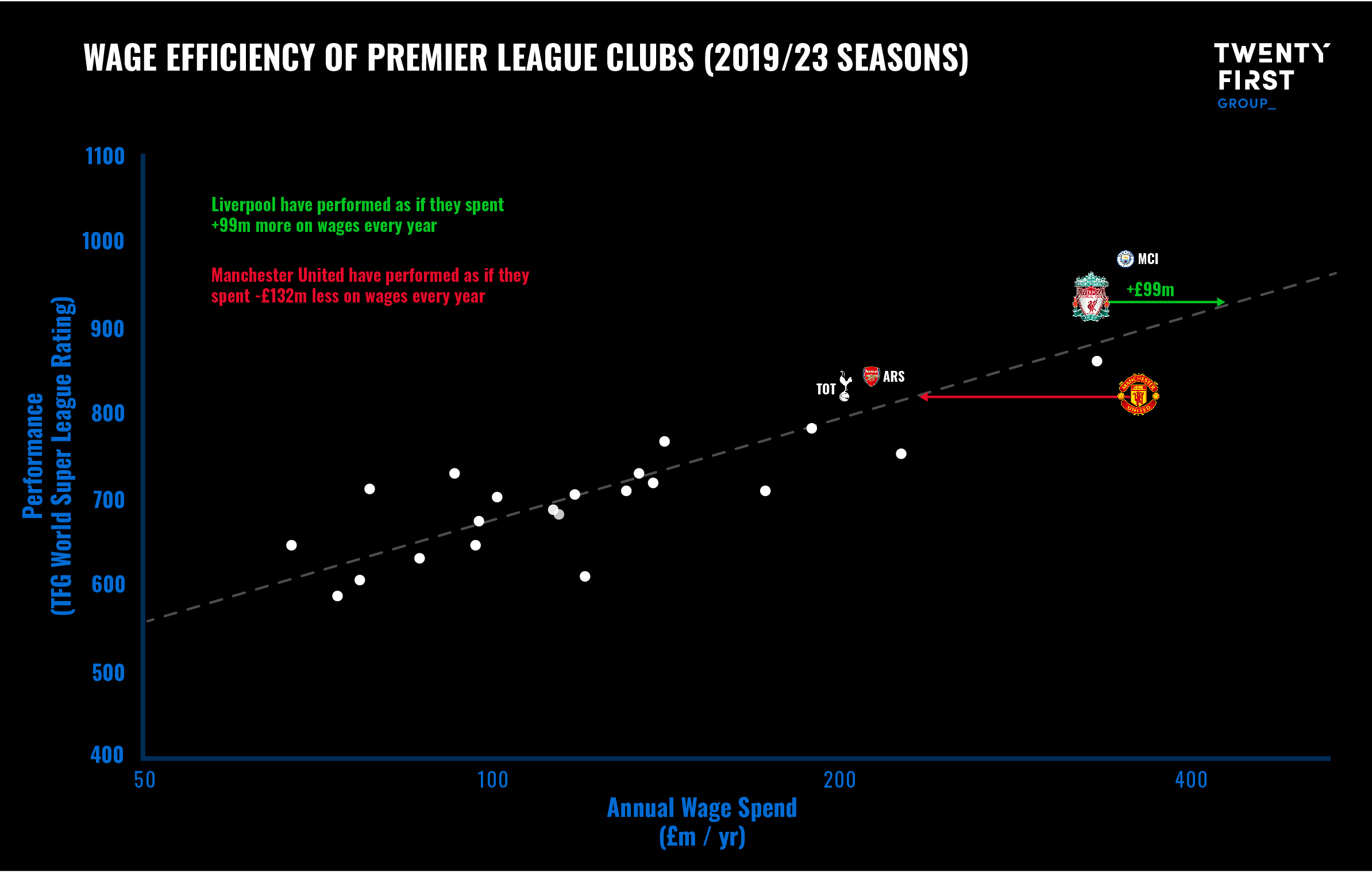 In this context, if you are considering buying either a minority or a majority stake in Manchester United or Liverpool FC, one of the most critical pieces of information to understand when walking into such an investment is the asset’s state of performance and wage efficiency, and how these compare to your appetite and ambitions for the future.