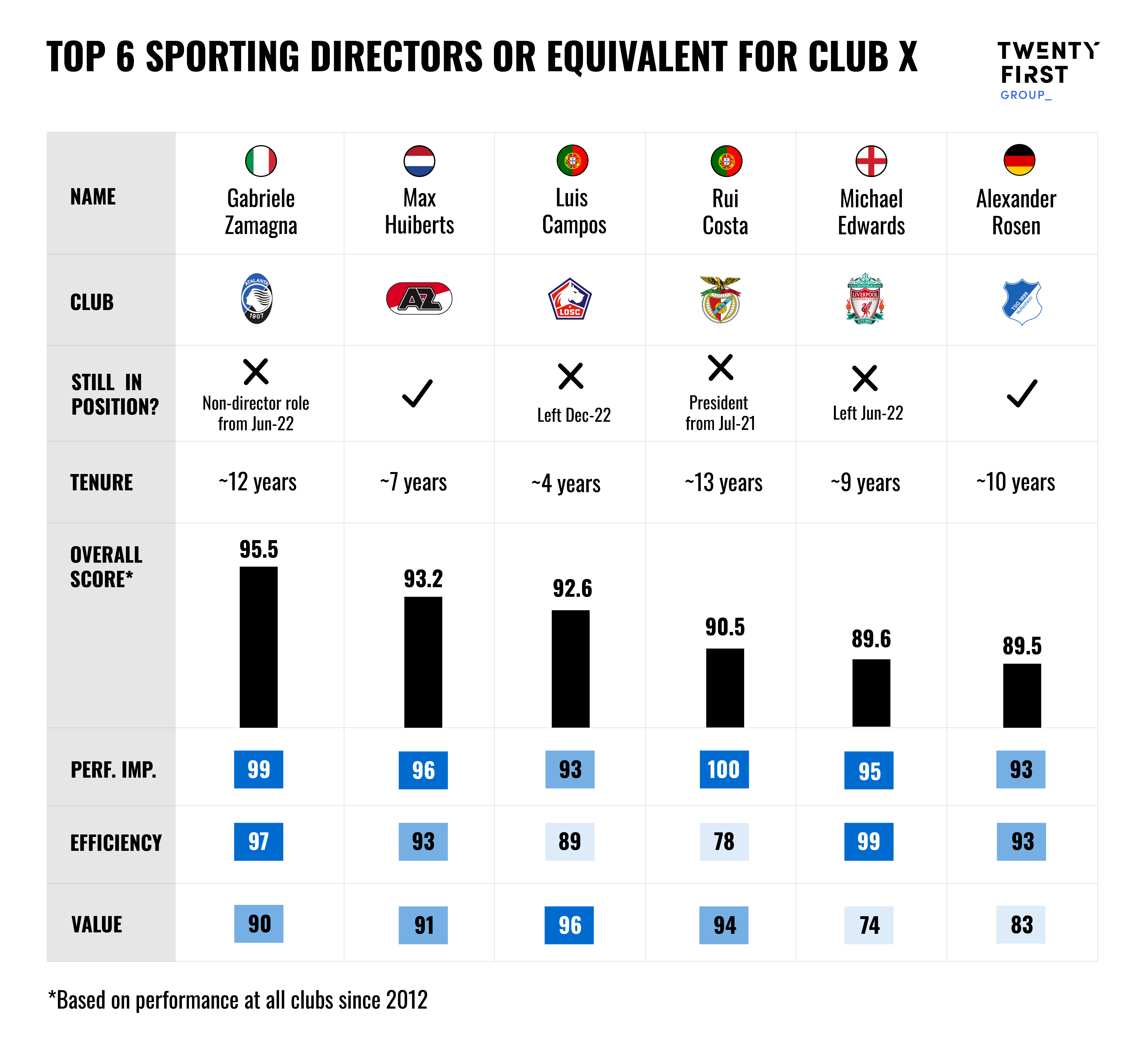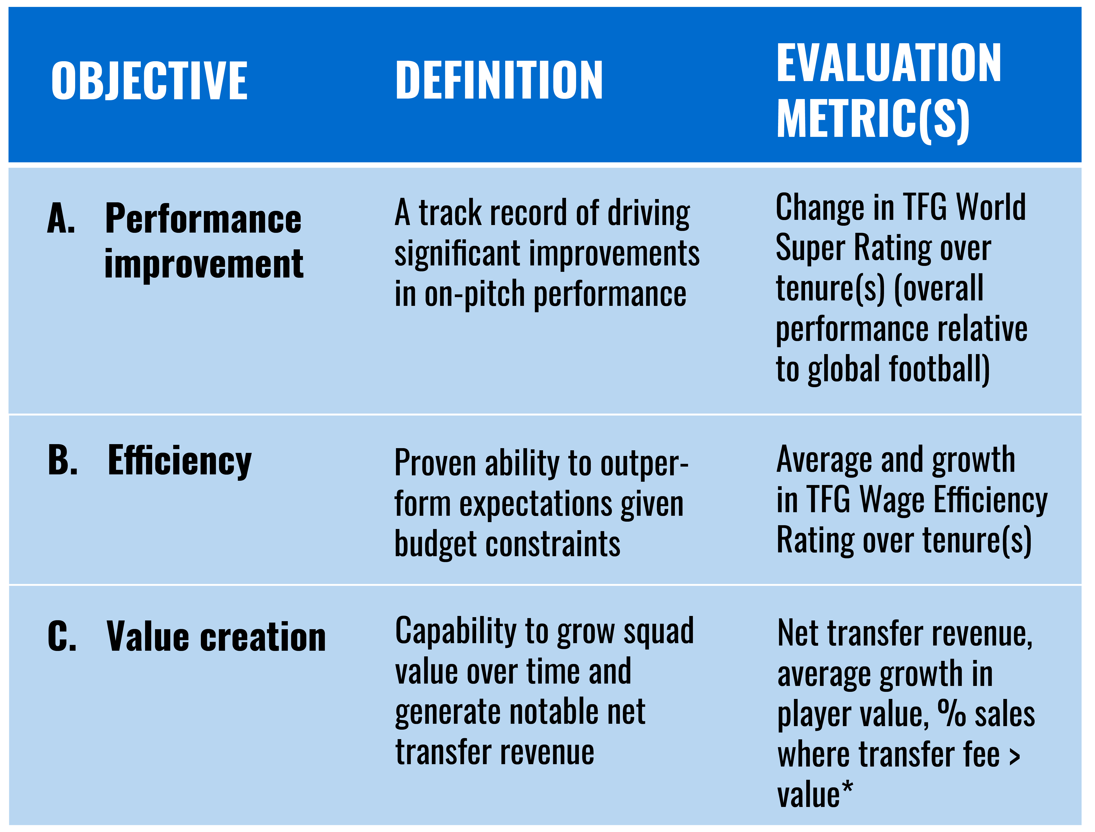 So who are football’s best performing sporting directors? In line with ‘Rule 4’, this depends heavily on a club’s priorities. For this example, let’s imagine a leading “Club X’ has the following objectives (of equal importance).
