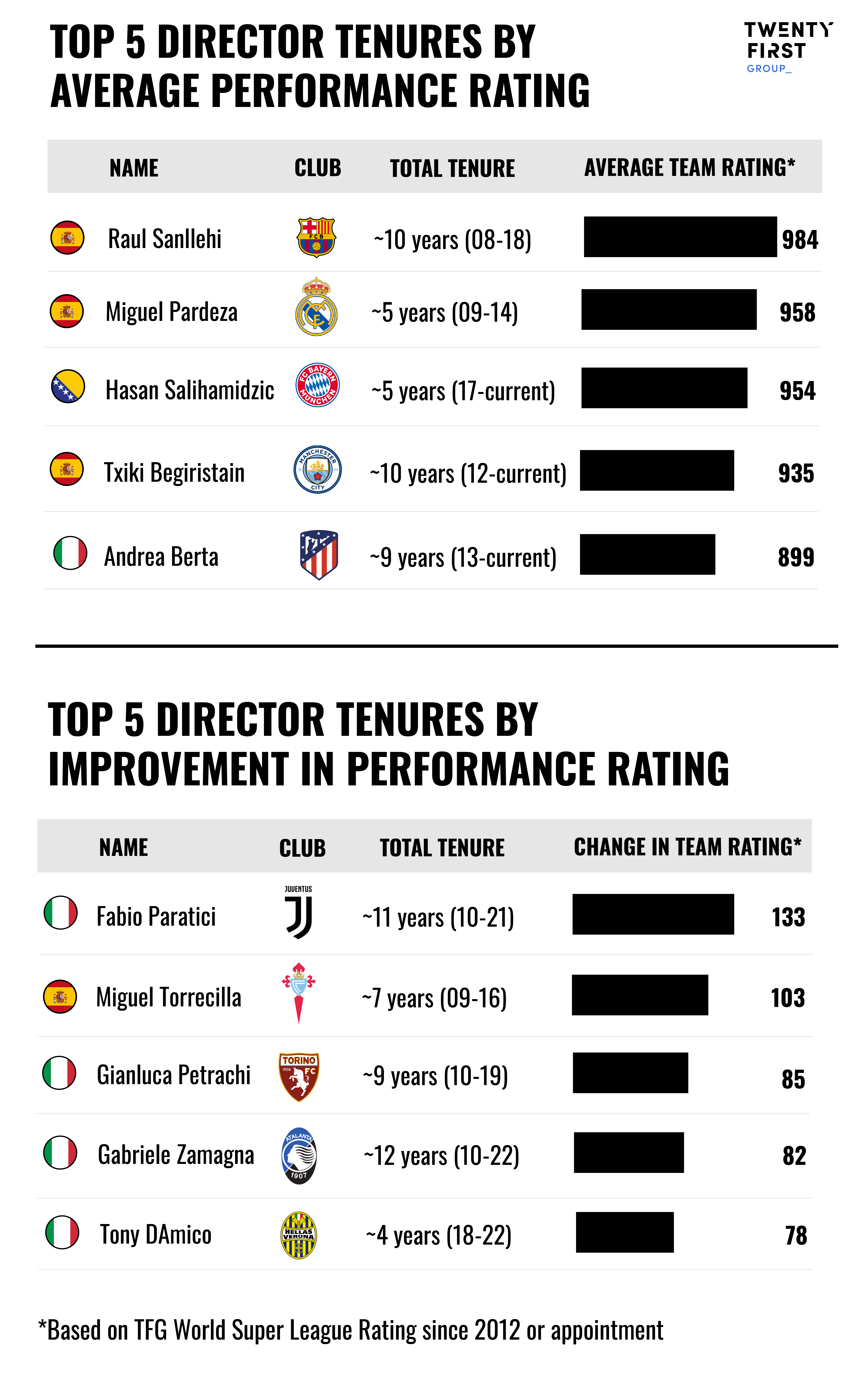 - Starting point – Performance needs to be measured alongside a director’s starting point. Based on our World Super League Model, Sandelli’s Barcelona and Pardeza’s Real Madrid were predictably the two tenures with the highest average performance (see chart below). However, Fabio Paratici’s tenure at Juventus represents the biggest uplift in performance over the last 10 years. Paratici joined the club after 2 consecutive 7th place finishes, then went on to win 9 consecutive Serie A titles and challenge the best clubs in Europe. Torrecilla’s Celta de Vigo and Petrachi’s Torino were also impressive, with an overall improvement roughly equal to the difference between an average Europa and Champions League team.