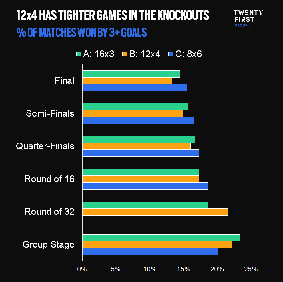 The World Cup organisers should also seek to maximise jeopardy in the games with the highest stakes, and our simulations suggest that matches in the latest stages of the competition are the least likely to be one-sided and won by 3+ goals in the 12×4 format.