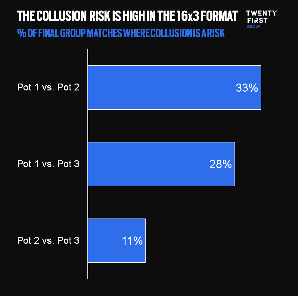 A major issue with the 16×3 format is the possibility for collusion between teams to ensure both qualify ahead of the third team in the group. Our modelling suggests that this risk is particularly high when the two highest seeds play in the final round of games; the fears that a repeat of the ‘Disgrace of Gijón’ could materialise are well-founded.
