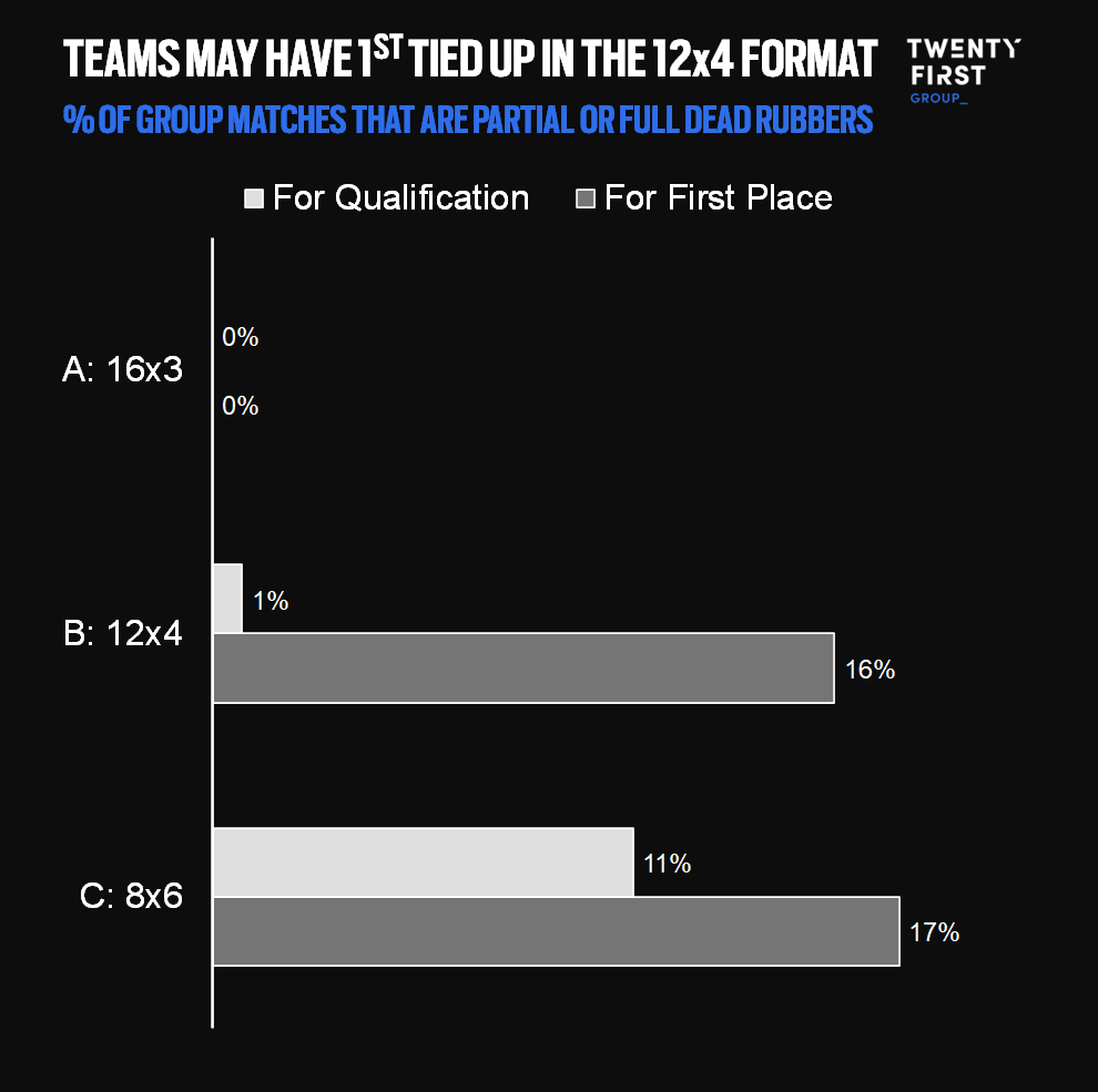The upside of this format is that it guarantees no dead rubbers: teams will always be playing for something in their final group game. The 12×4 format also almost always guarantees that there is qualification on the line in every game, though the battle for first place is more often tied up.