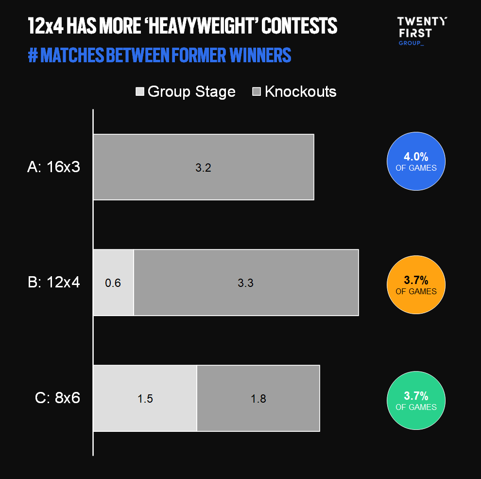 Fans also tend to watch heavyweight matches in higher numbers, with the 2022 final demonstrating the value of two of the game’s giants meeting in high-stakes games. The 12×4 format excels here, partially due to the additional number of games, though it also has a slightly higher likelihood of a ‘heavyweight’ final (42%, compared to 39% for option A and 32% for option B).