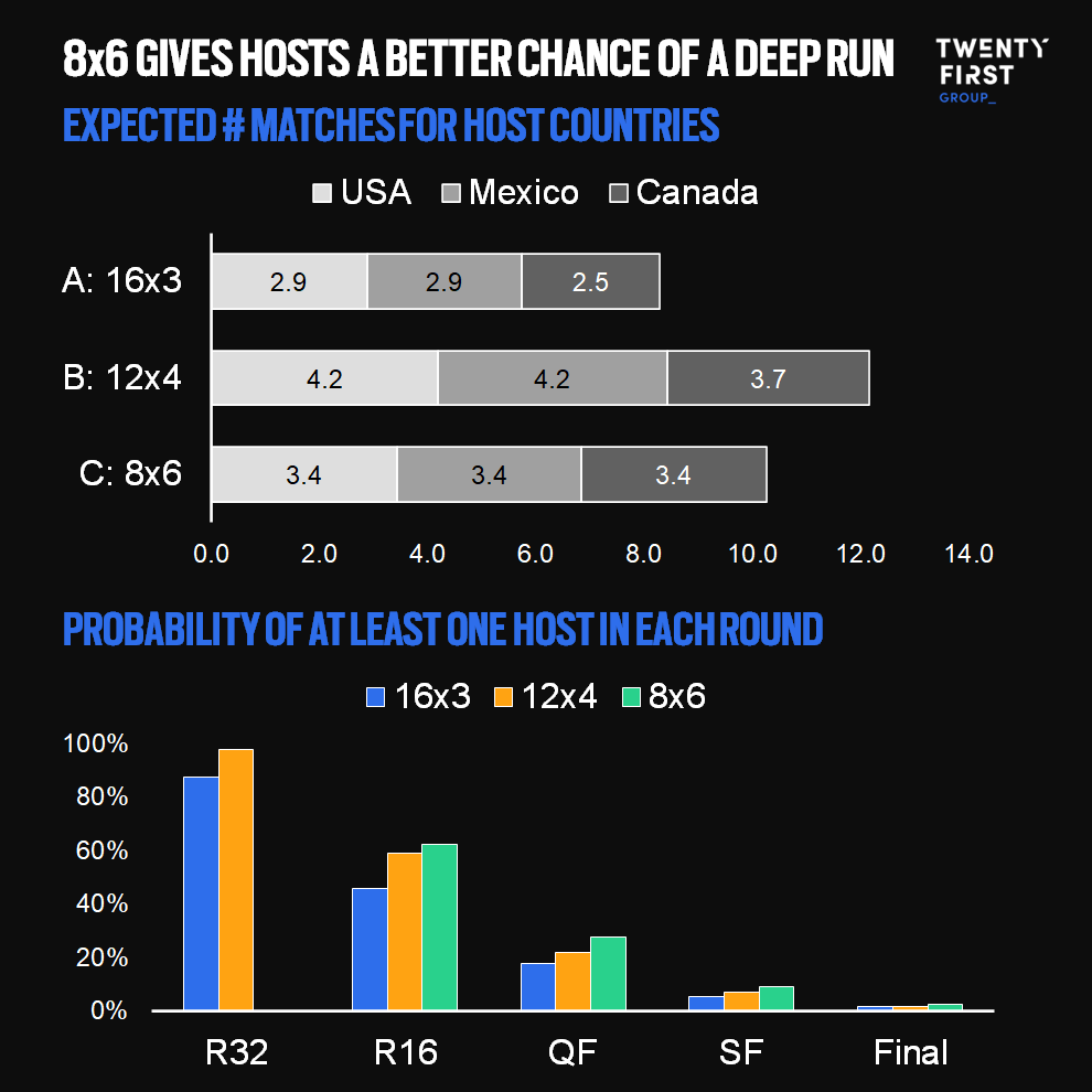The success of World Cups depends in part on the success of the host countries. An early elimination can take energy out of the tournament, and dilute the connection that visiting fans have to the host. Different formats offer different opportunities for hosts, with the Swiss-style 8×6 format giving a better than 1-in-4 chance that one of the quarter-finalists is a host nation.