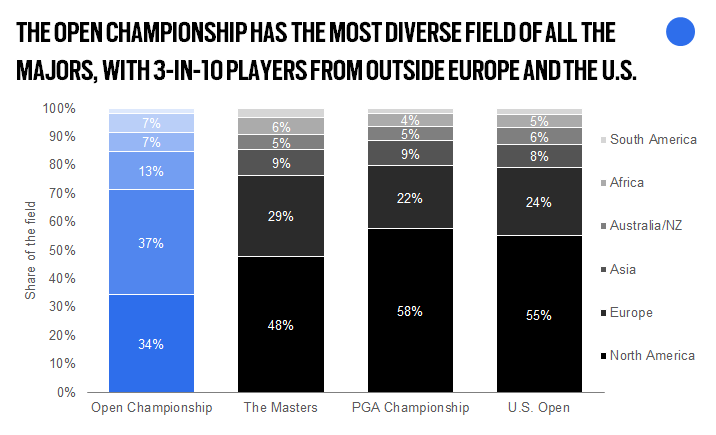 That the R&A’s flagship event is more diverse than any other major is not by accident. The R&A’s raison d’etre is to make golf more accessible, appealing and inclusive, and to ensure it’s thriving 50 years from now. The R&A have invested heavily in their partnerships with 157 affiliate organisations to build a deeply connected network that reaches 143 countries. The focus on growing the game at the grass roots and ensuring The Open is truly open to all is a key lever in the strategy. Providing a platform at the pinnacle of the game for players of all nationalities is key to ensuring the next generation of super stars includes players from everywhere.