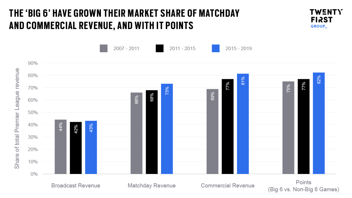 The Premier League has been the final bastion for balance among Europe’s ‘big 5’ – a truth reflected in the number of different title winners over the last 10 years (five). But while the league has been resistant to major changes to media rights distribution (the introduction of merit-based payments from the overseas media rights pool in 2017 was still relatively small in the context of overall distribution), the biggest six clubs have soared in popularity in this time, meaning that they have disproportionately grown matchday and commercial revenue, and with it their share of league table points – a trend reflected in other European leagues.