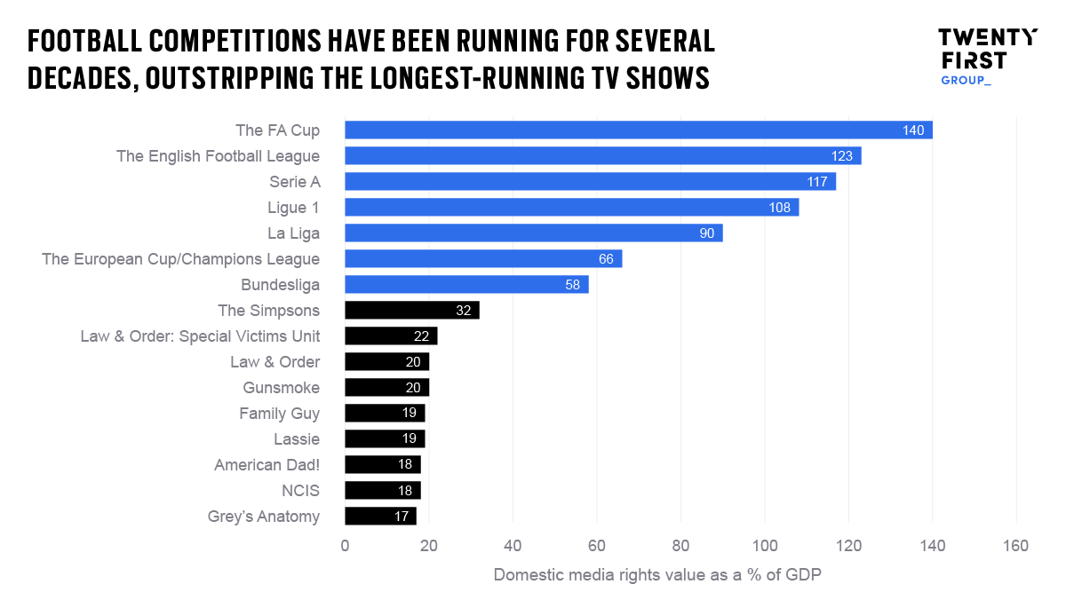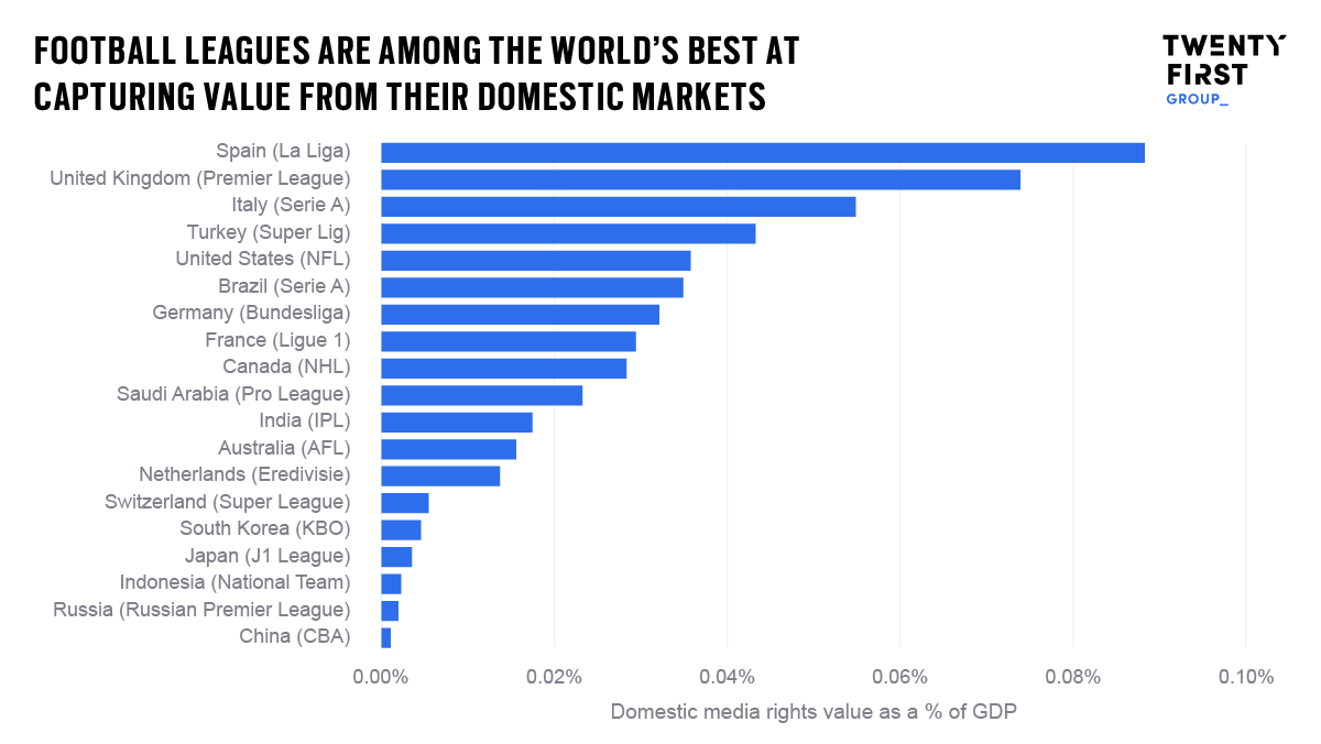 Third, while domestic media rights deals for sports like the NFL are enormous – especially on a per game basis – they have the advantage of being marketed to the world’s biggest economy. When measured as a % of GDP, the Premier League, La Liga and Serie A actually out-performs the NFL suggesting that European football fans are often willing to spend more per capita to watch football than Americans are to watch NFL.