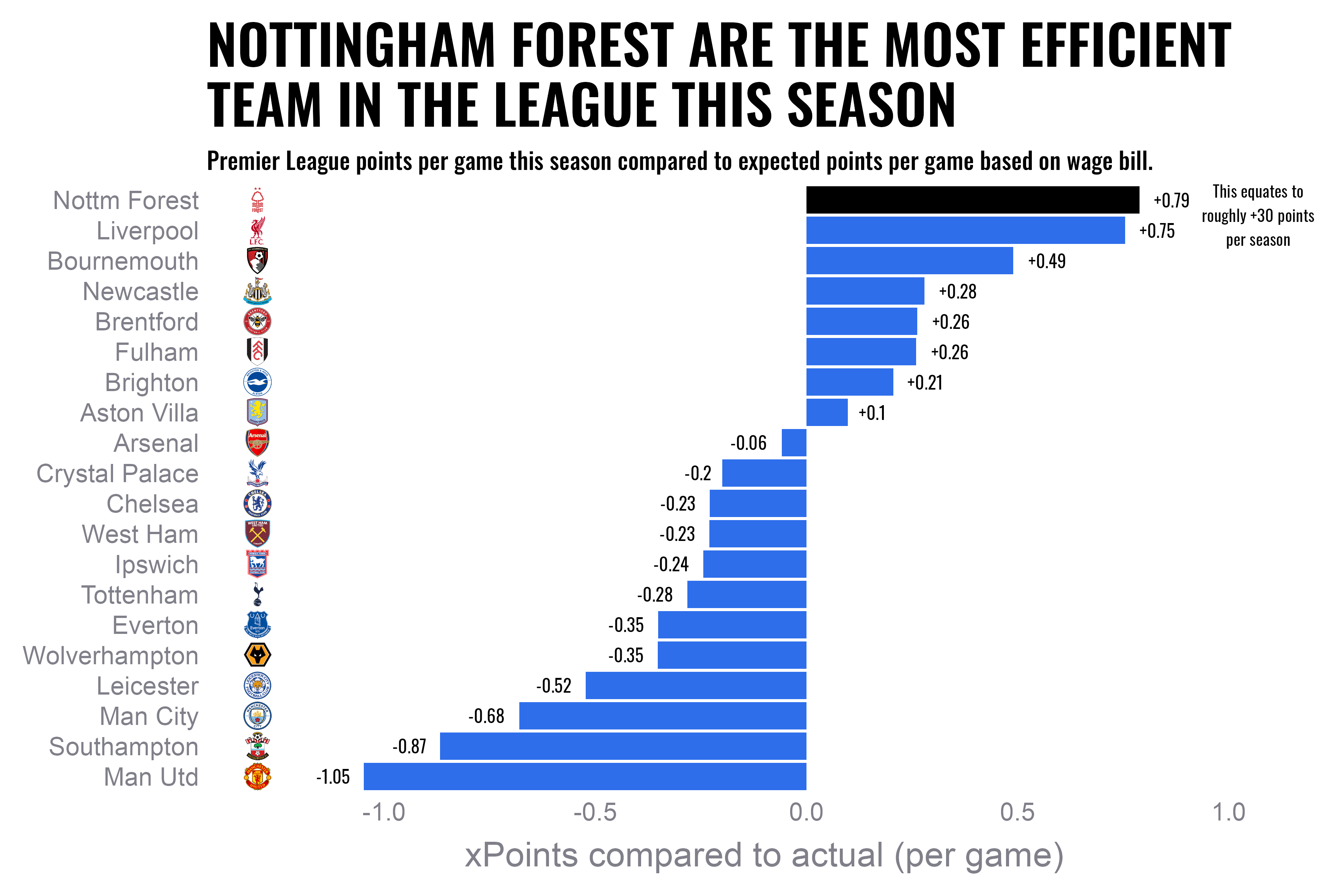 Tonight, Nottingham Forest face Liverpool in arguably the biggest game of the season. But it’s a clash that highlights more than just on-field talent—it’s a showcase of the Premier League’s two most efficient clubs. According to our models, Forest and Liverpool rank first and second, respectively, in spend efficiency this season.