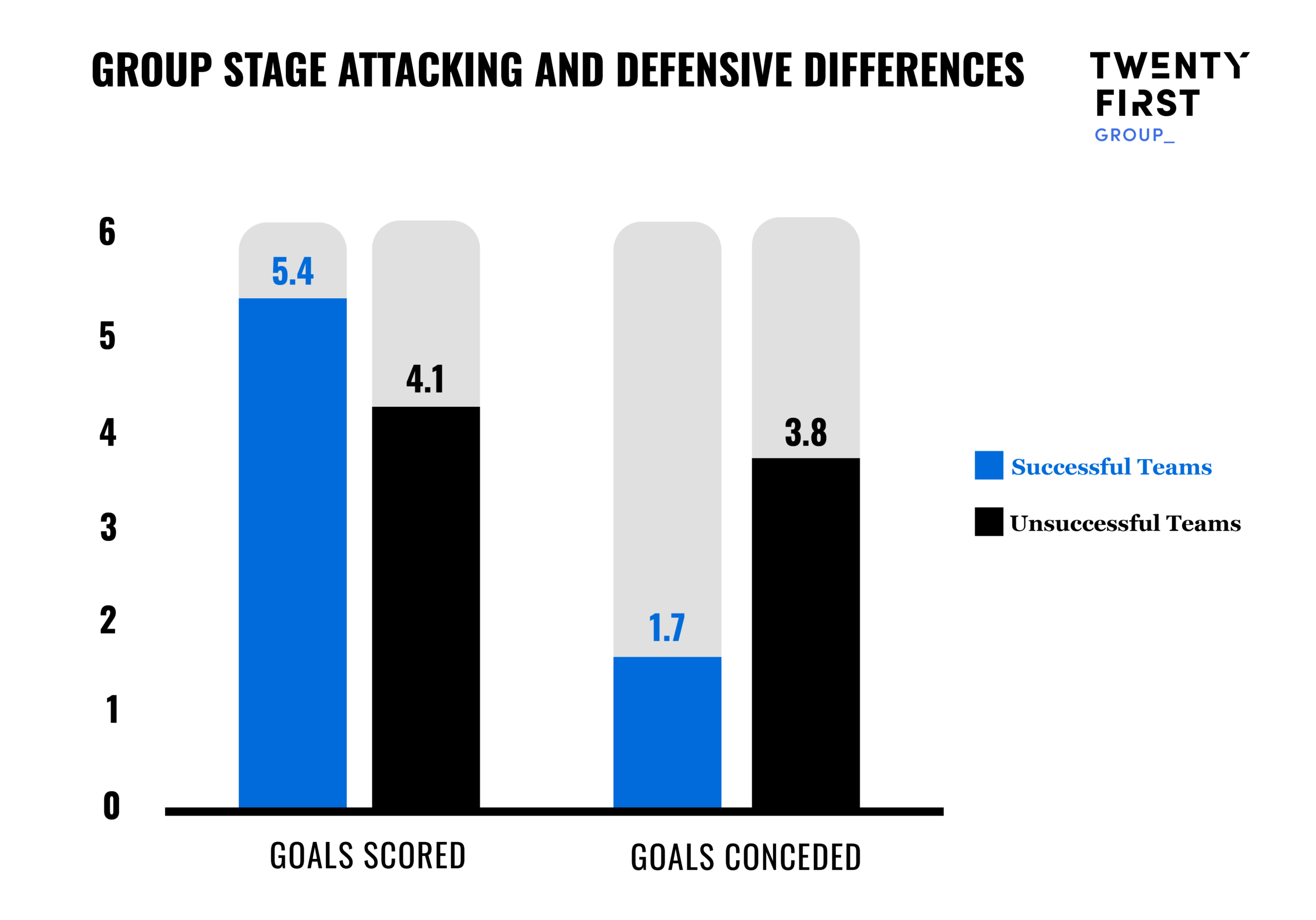 With such little time to work with the players, coaches often struggle to pull together a cohesive national team from back to front. The evidence points to the importance of getting things right defensively first: in the group stages, successful teams conceded 2.1 fewer goals than unsuccessful sides, a bigger difference than in attack (1.3 goals more).