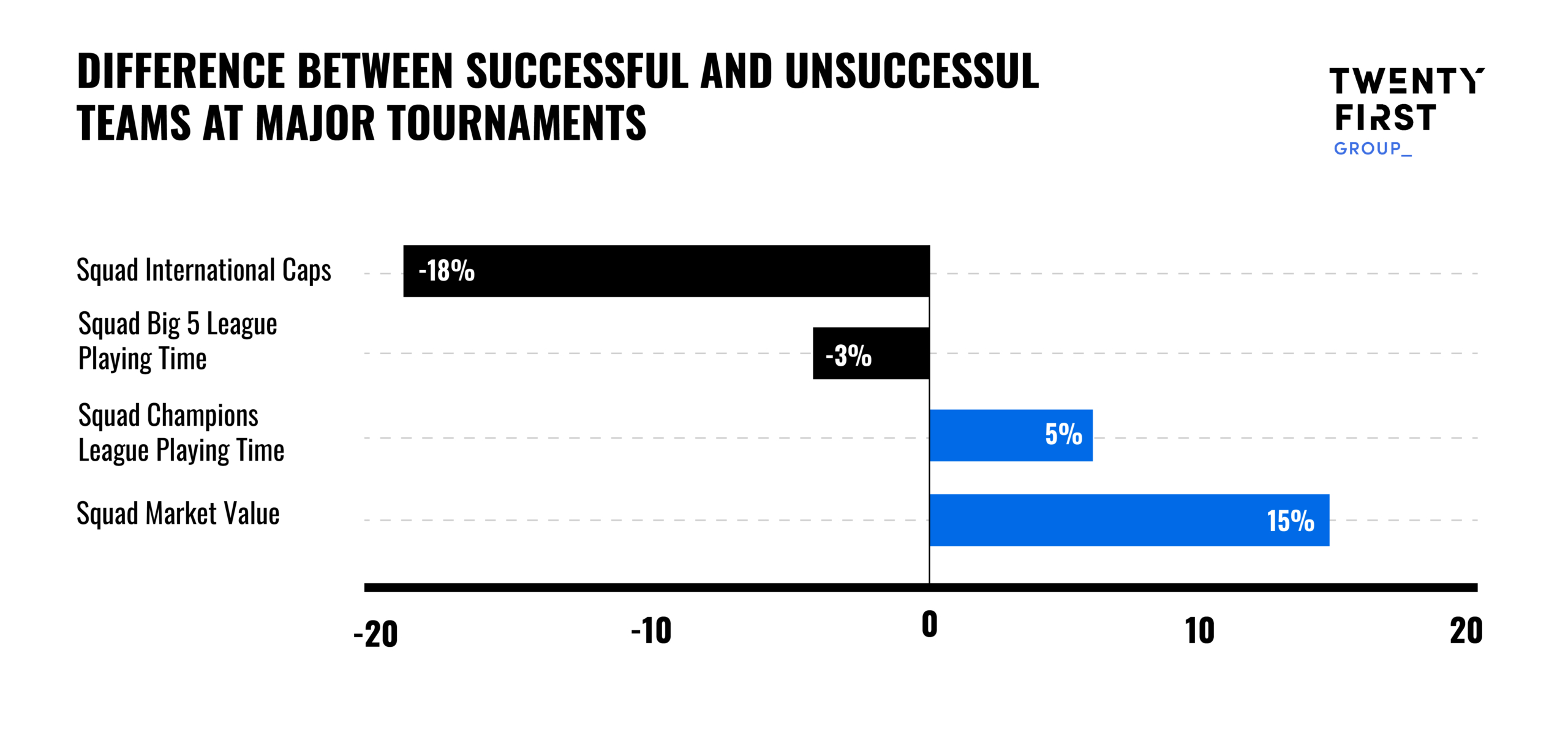 Using Twenty First Group’s Intelligence Engine, we’ve picked out the areas in which successful teams have differentiated themselves from unsuccessful teams. To enable a fair comparison, we’ve focused on the ‘big 5’ European countries plus Portugal, the Netherlands, and Belgium, and compared tournaments where these teams reached semis and finals, to tournaments where these teams went home early, picking out the key success factors since 2010.