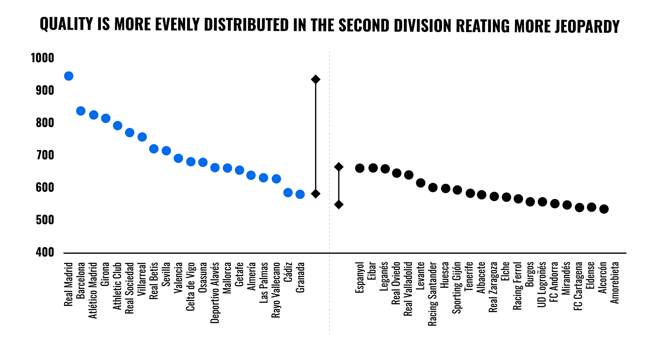 This makes sense. First, the best teams in a second division tend to get promoted, keeping promotion races tight each year. Second, resources tend to be more concentrated among the biggest clubs. The uneven distribution of media revenue, regular participation in UEFA competitions & disproportionately high commercial revenues are all factors that afflict top divisions most.