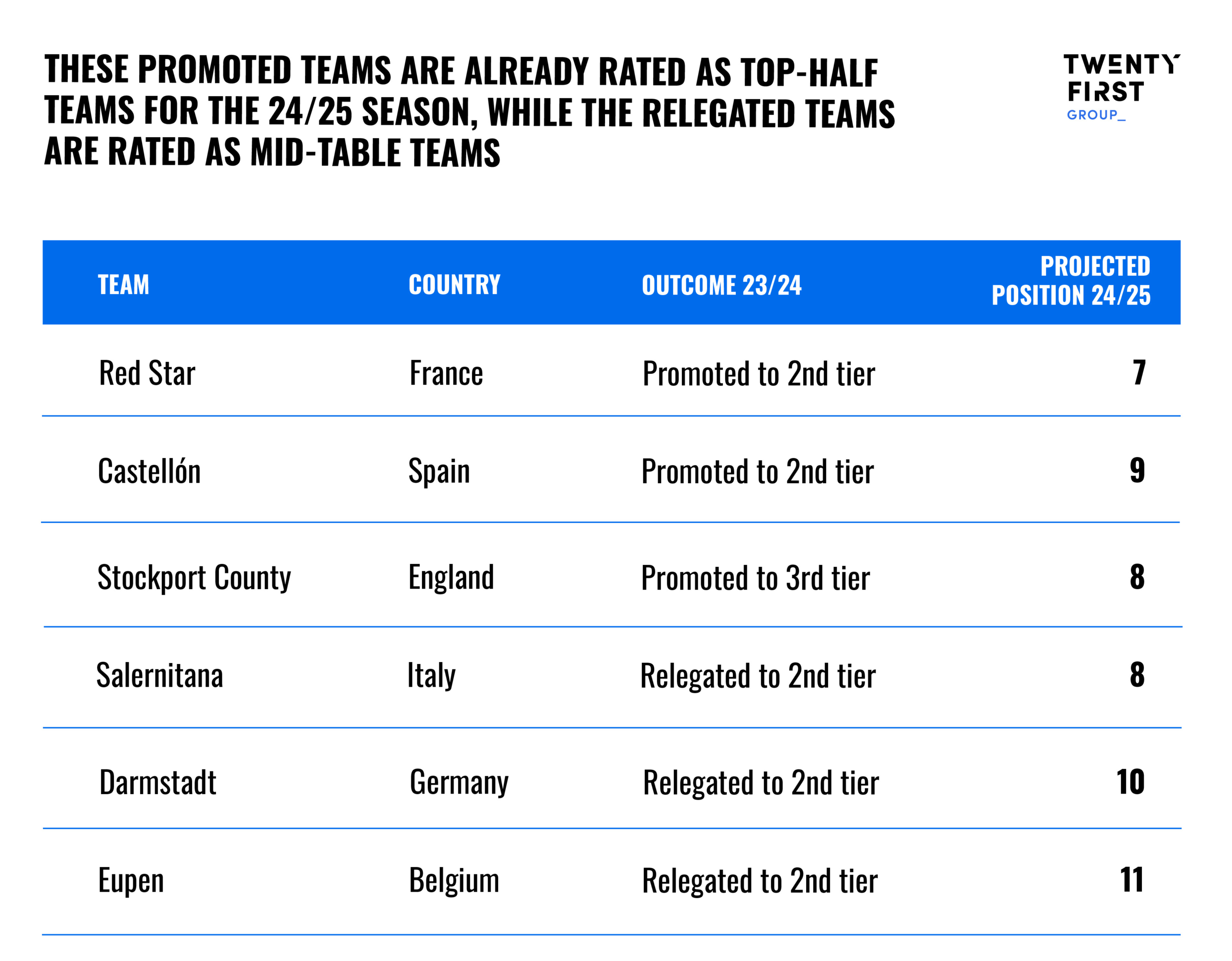 With promotion and relegation places being decided across Europe, below are a number of teams whose place in their new division next season is likely to surprise many. For these clubs, having a true sense of where they are in their new league is critical for deciding the extent to which a squad needs changes this summer. The same is true for their competitors, who must assess the strength of their division before weighing up squad building decisions.
