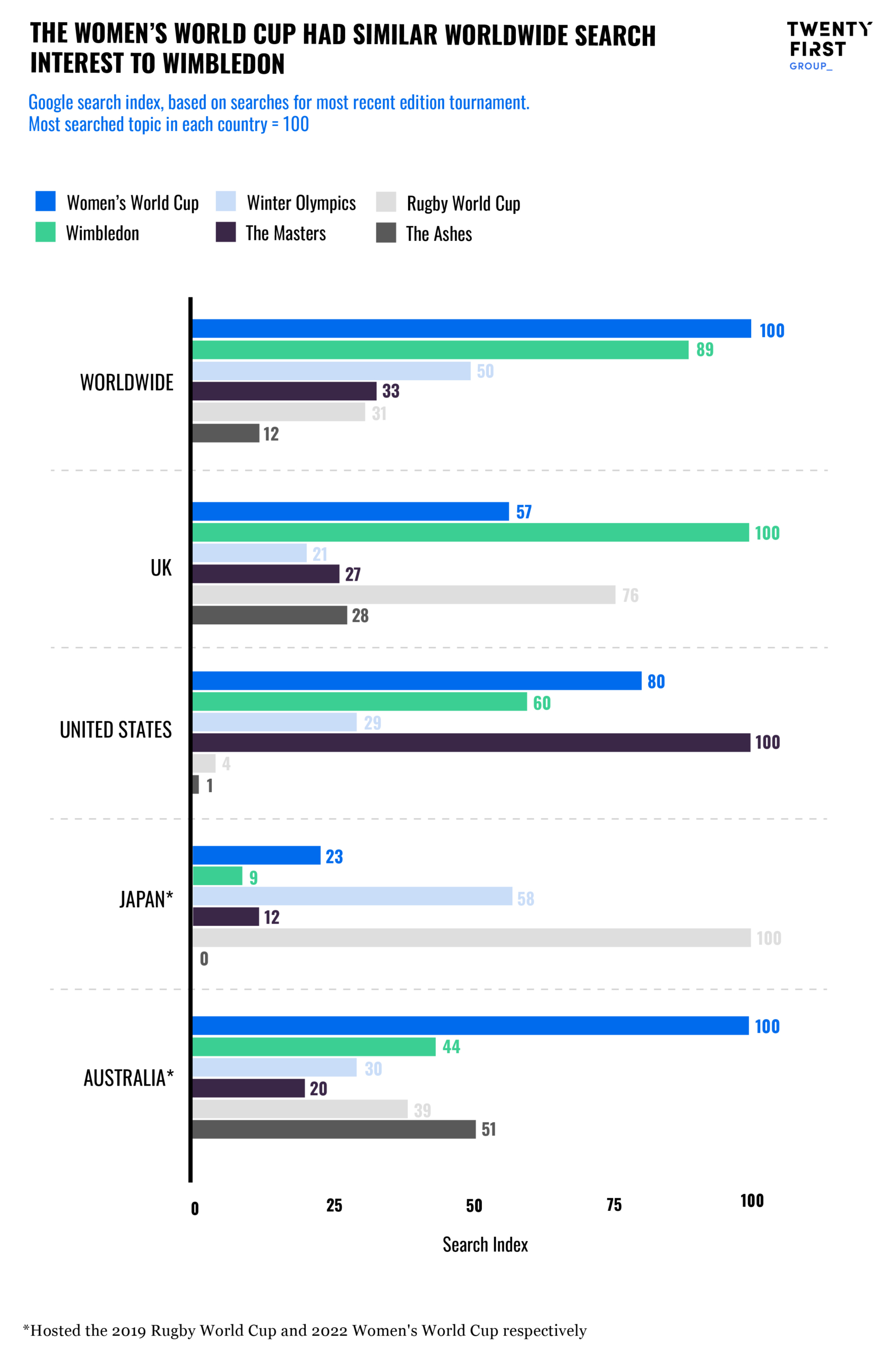 The Women’s World Cup hit a similar number of peak Google searches to Wimbledon this year, and a greater volume than major sporting events such as the Masters and the Ashes. While these events drew more searches than the Women’s World Cup in their core markets, the Women’s World Cup benefitted from football’s global appeal to hit a higher overall volume of searches. And there were more searches for the Women’s World Cup in host nation Australia this summer than there were for the Ashes.