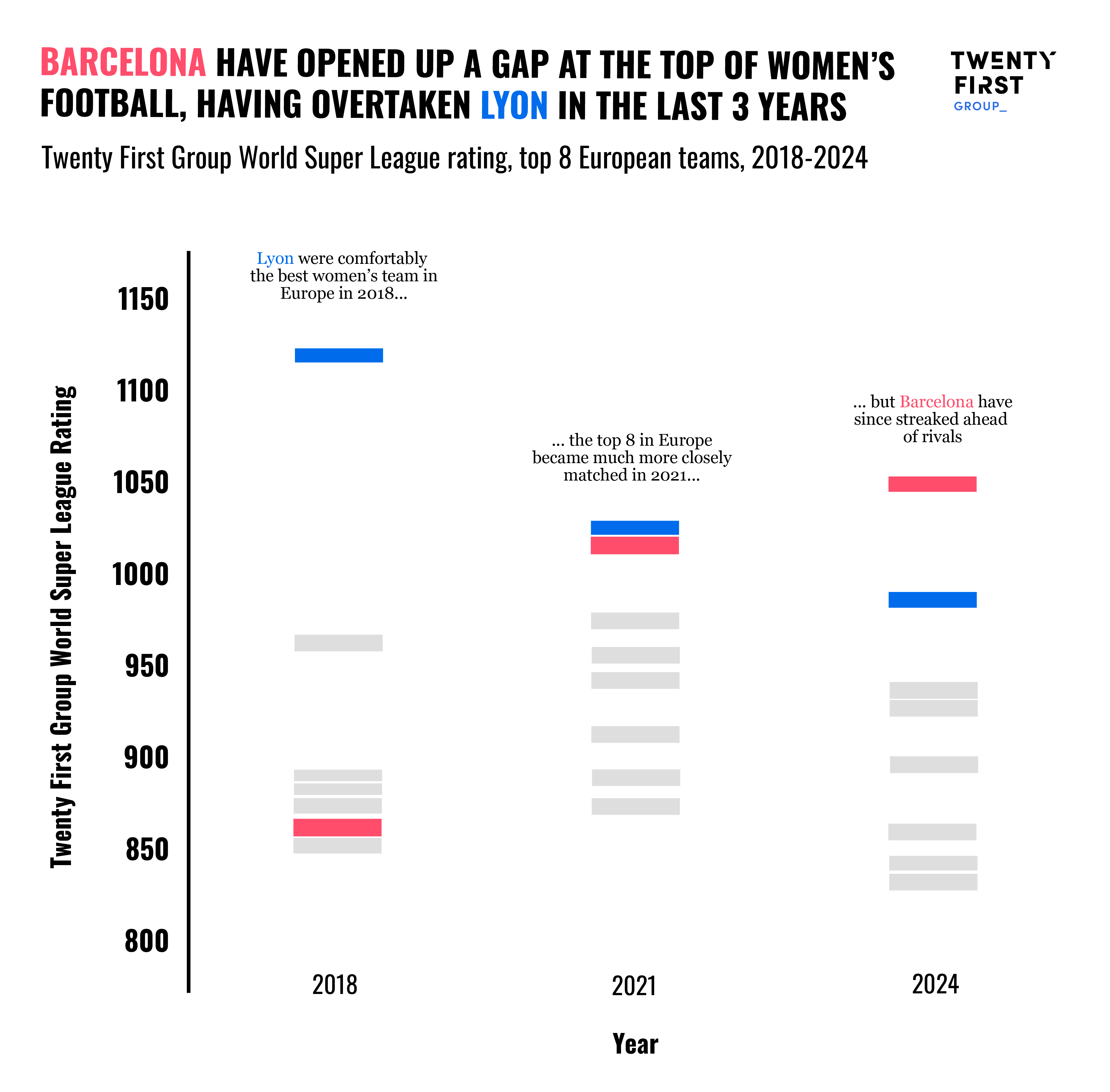 FC Barcelona Femení are setting incredible standards in the women’s game. From 2018, when Olympique Lyon dominated European football, the gap between Europe’s best teams had been closing according to our World Super League Model. Now, however, Barcelona threaten to open a new chasm back to their rivals (below), in an era of rising professionalism across the game.