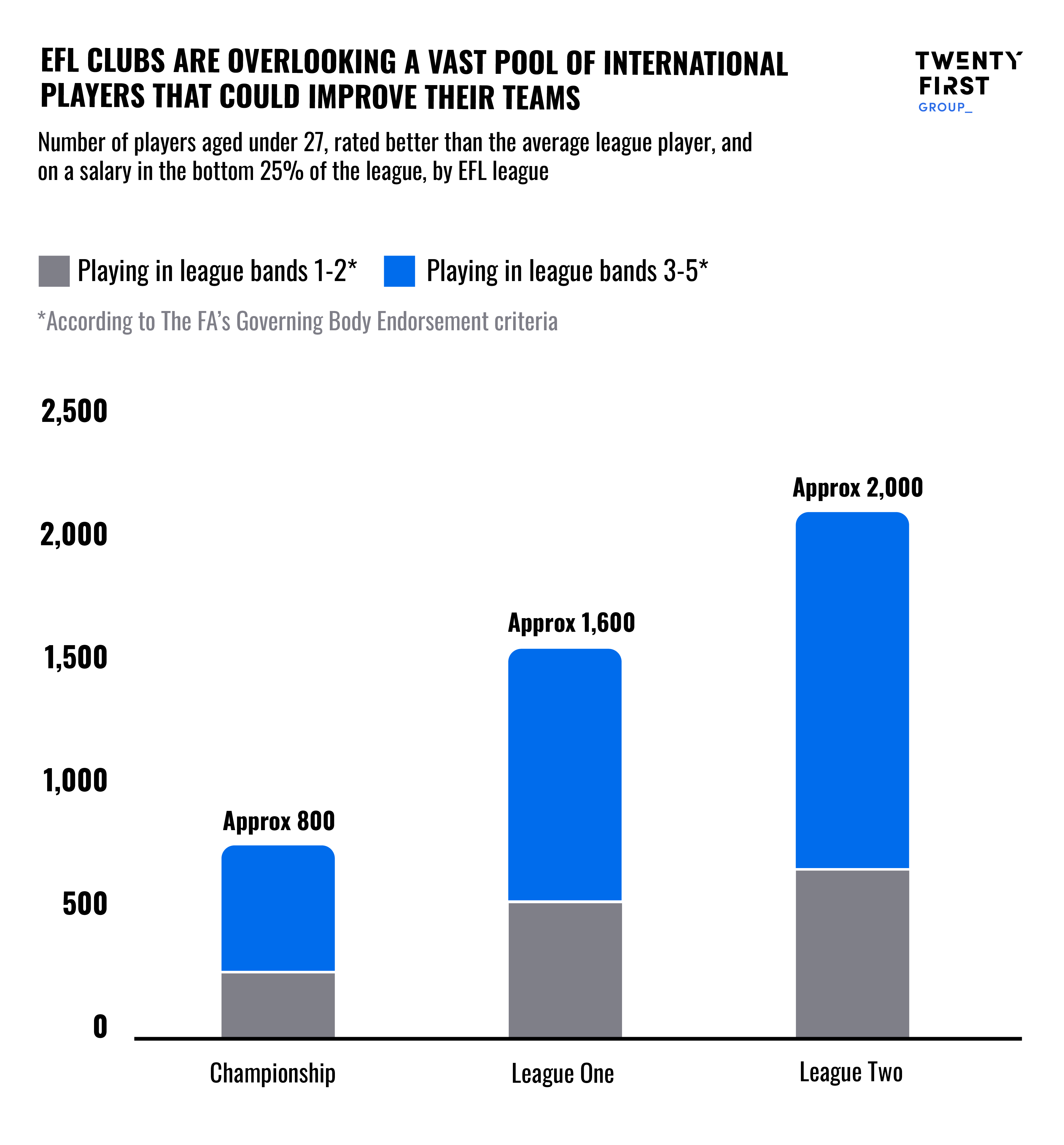 Yet, just 17% of Championship signings were from non-British leagues outside the top two bands in the GBE criteria. This is despite our Player Model showing that there are nearly 1,000 players currently playing outside these leagues who are under 27, good enough, and affordable enough to perform in the Championship.