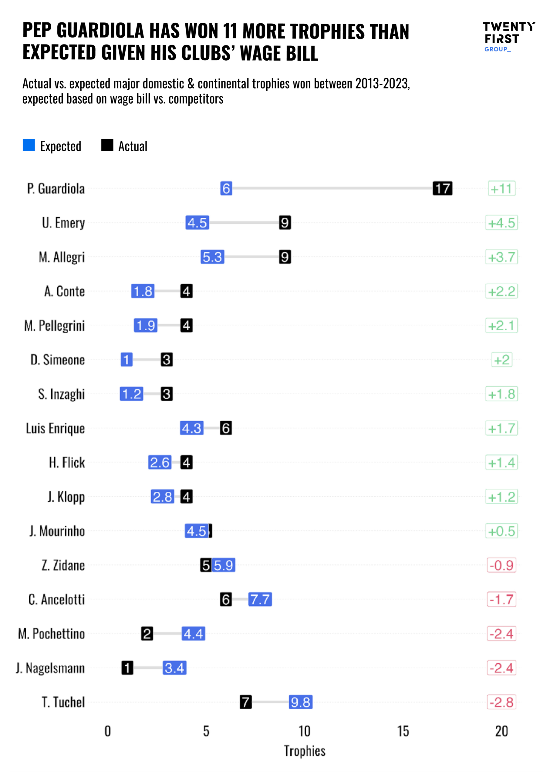 During the same time period, Pep Guardiola has won 11 more trophies than expected (6) – suggesting that even with the budgets he has had, he has demonstrated an incredible capability to win.