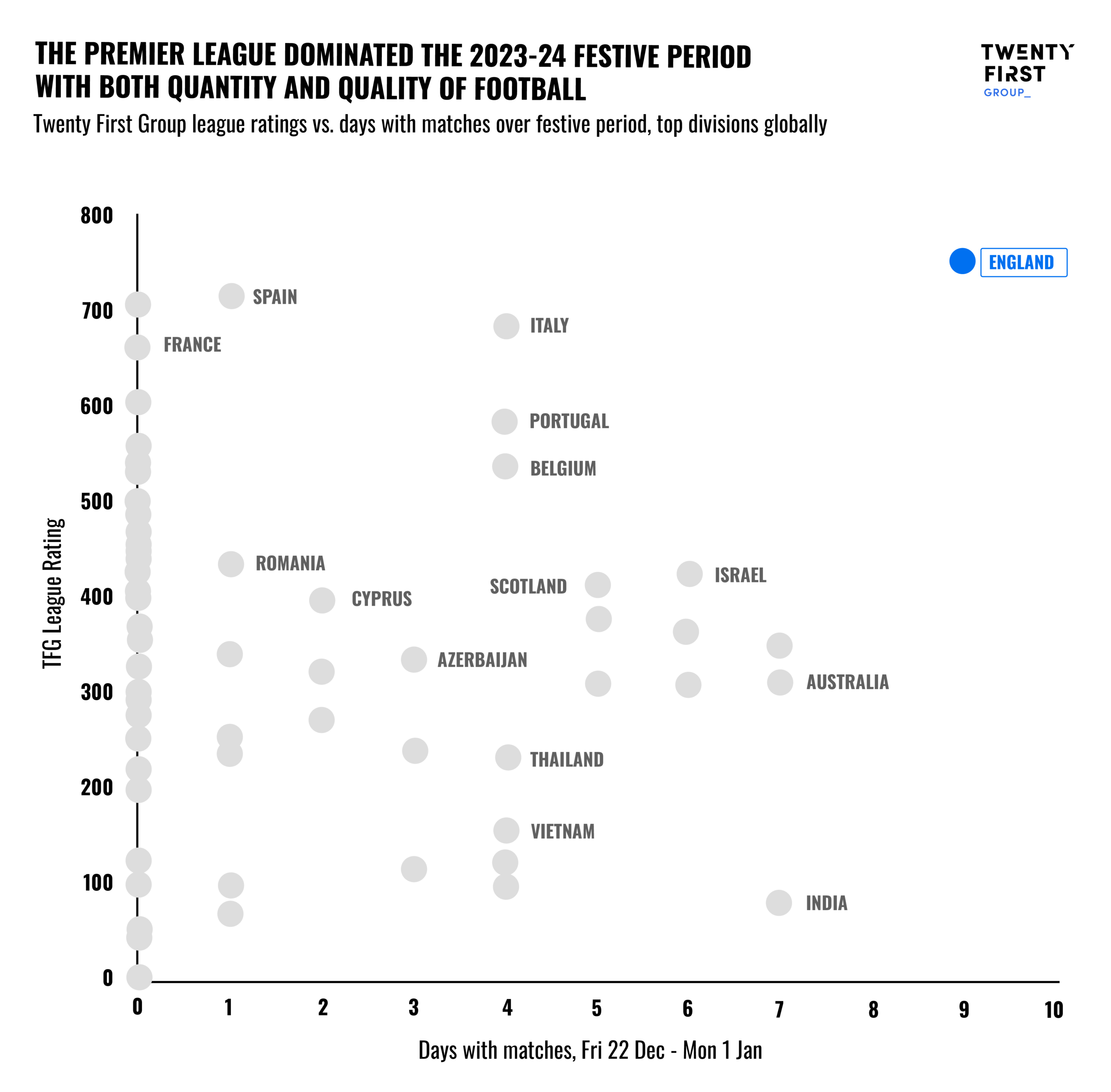 Traditions that underpin the status quo can often be an inhibitor for growth, innovation, or differentiation in sport. But in the case of the Premier League, English football’s long history of playing through the Christmas period sets it apart from any other league in the world during this time, as the chart below shows.