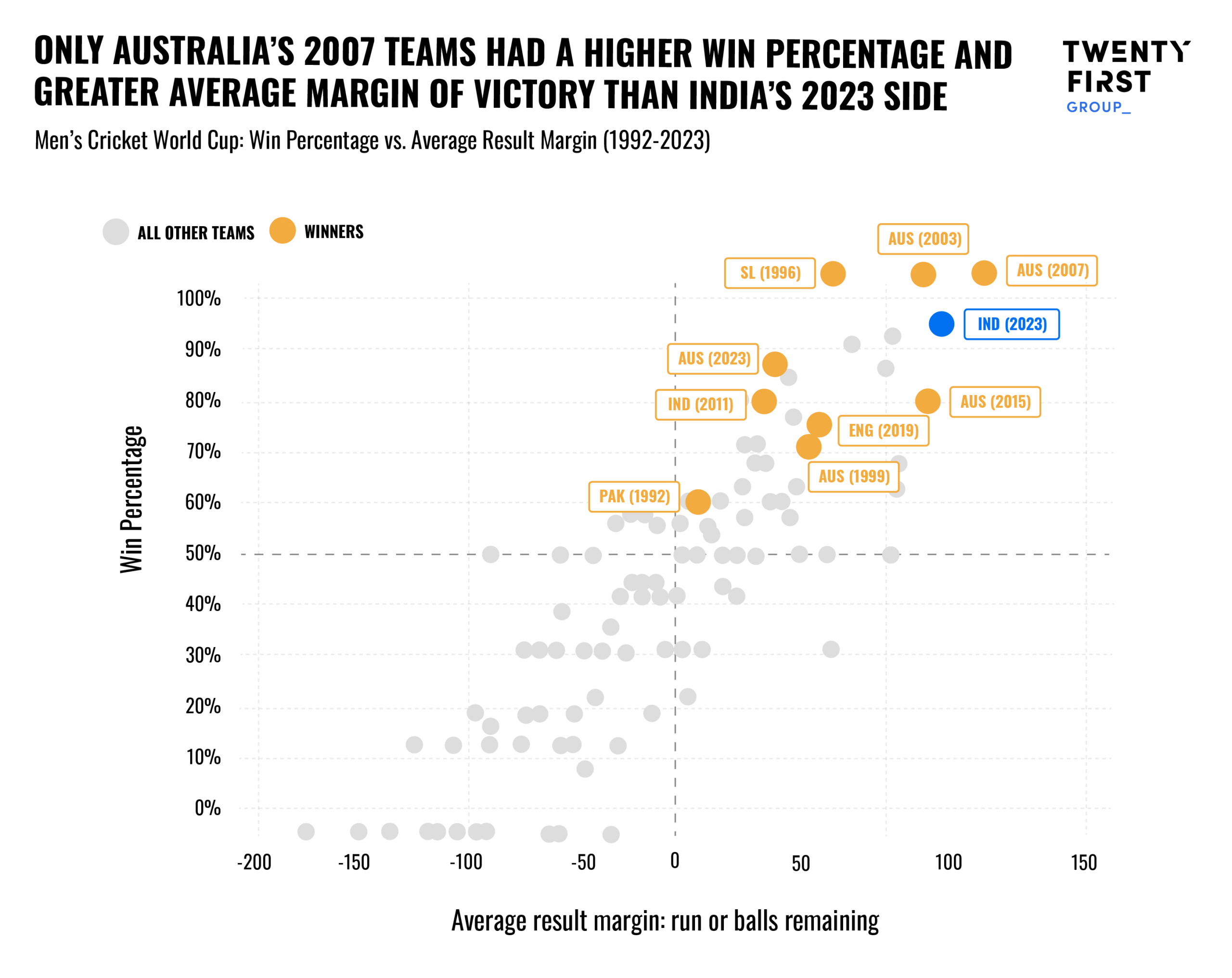 A win in Sunday’s Cricket World Cup Final would have put India’s 2023 team alongside – and possibly ahead of – Australia’s great 2003 and 2007 teams. Defeat means they’re the competition’s best-performing team to have not lifted the trophy, having gone into the match with a perfect record and an average margin of victory almost unmatched in the tournament’s history.